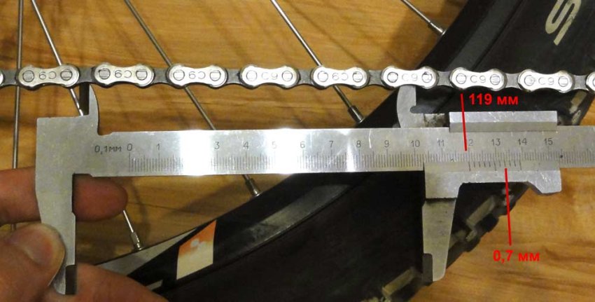 Как измерить степень износа велосипедной цепи при помощи штангенциркуля?