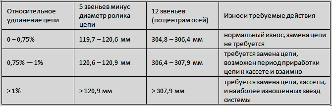 - 306,4-307,9 мм — цепь изношена, и в дальнейшем потребуется приработка новой цепи к кассете.