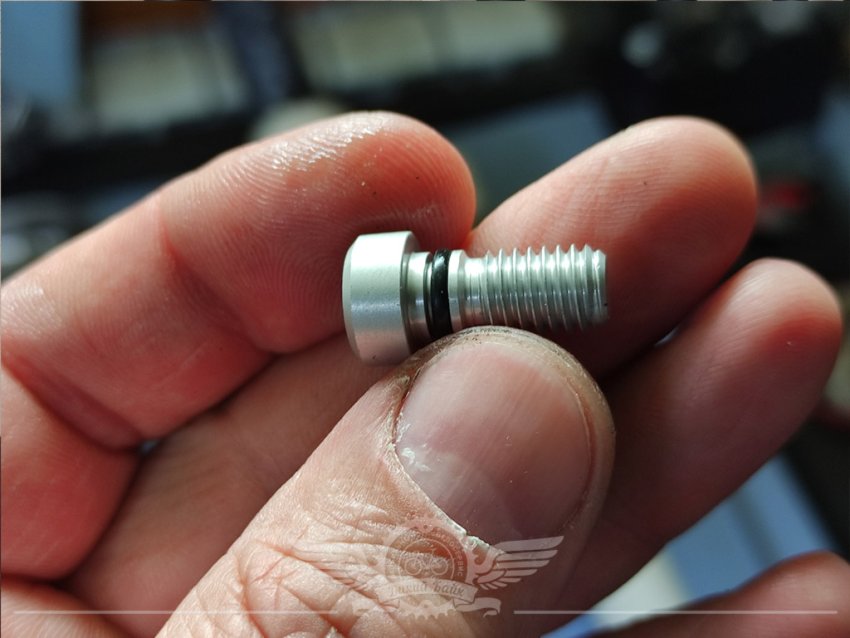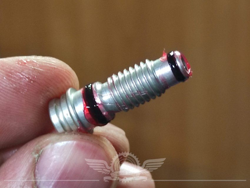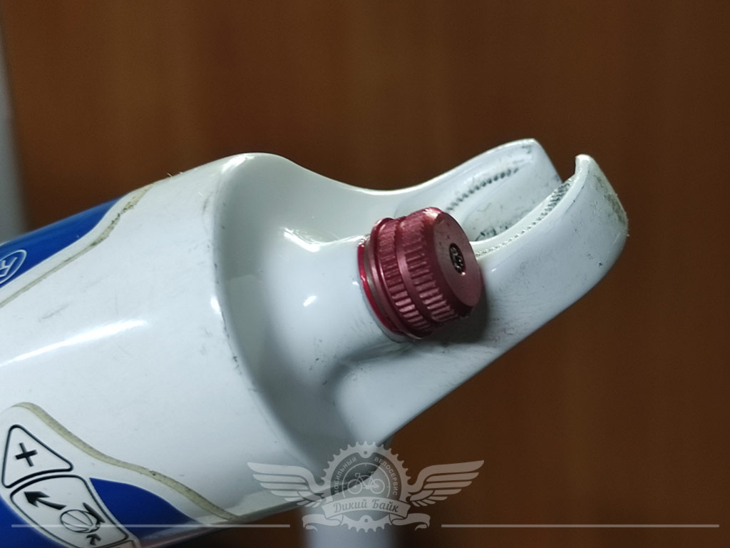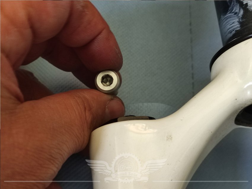 Вставляем полый болт в ногу, где есть регулировка отскока. Глухой болт закручиваем в другу ногу. Затягиваем оба болта с усилием 6Нм.