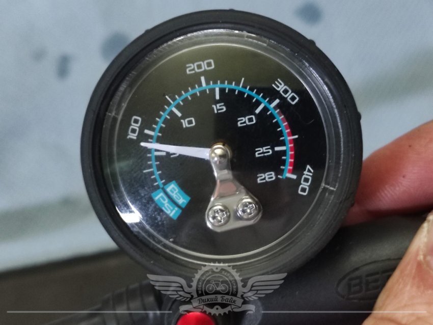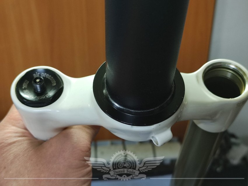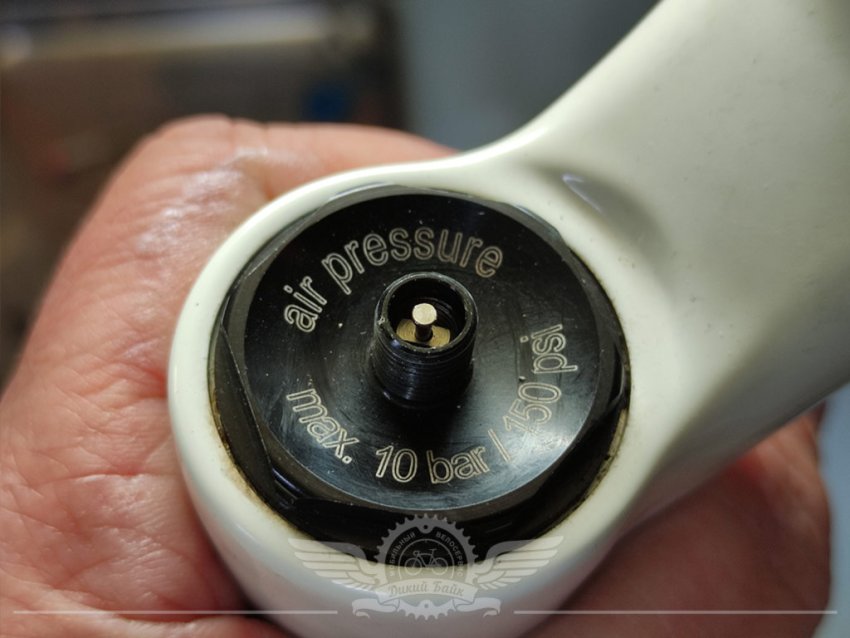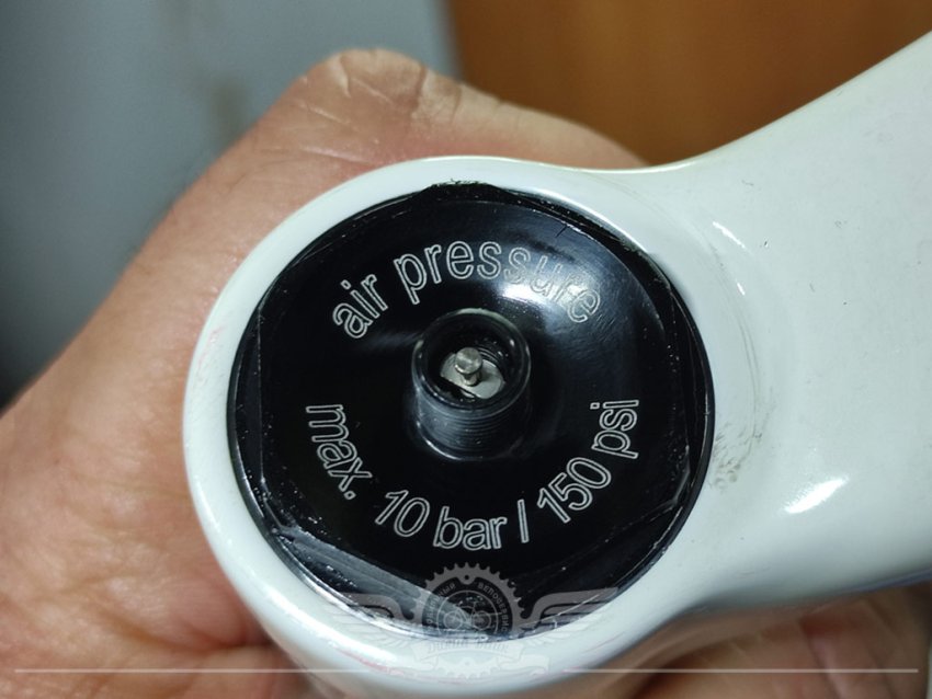 Замеряем давление в воздушной камере. Это больше хороший тон для механиков, чем правило — записать какое давление было в вилке клиента, чтобы потом накачать такое же. Естественно, если предварительно клиент не попросил о настройке вилки под свой вес. Тогда смотрим таблицу на левой штанине вилки.