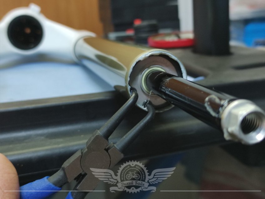 Убеждаемся, что демпфер зашел до конца и устанавливаем стопорную пружину острым краем наружу. Это необходимо для того, чтобы при сильном сжатии вилки масляный демпфер не сорвало с ноги.