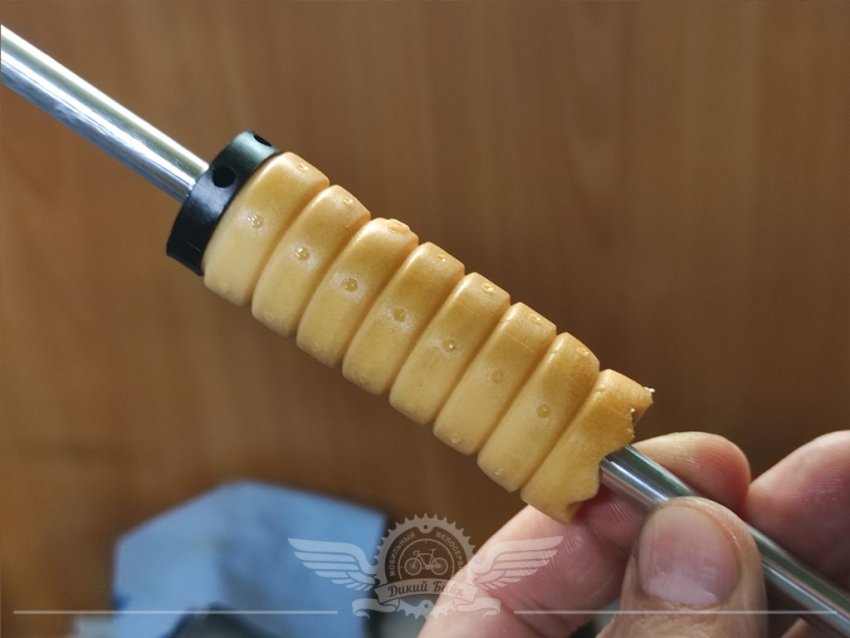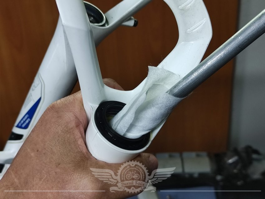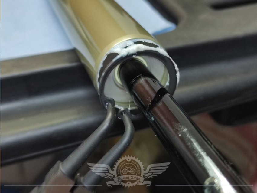 Наносим консистентную смазку Sram Butter на пыльники в штанах вилки. Распределяем ее равномерно по пыльнику и вставляем ноги в штаны.