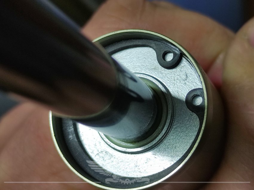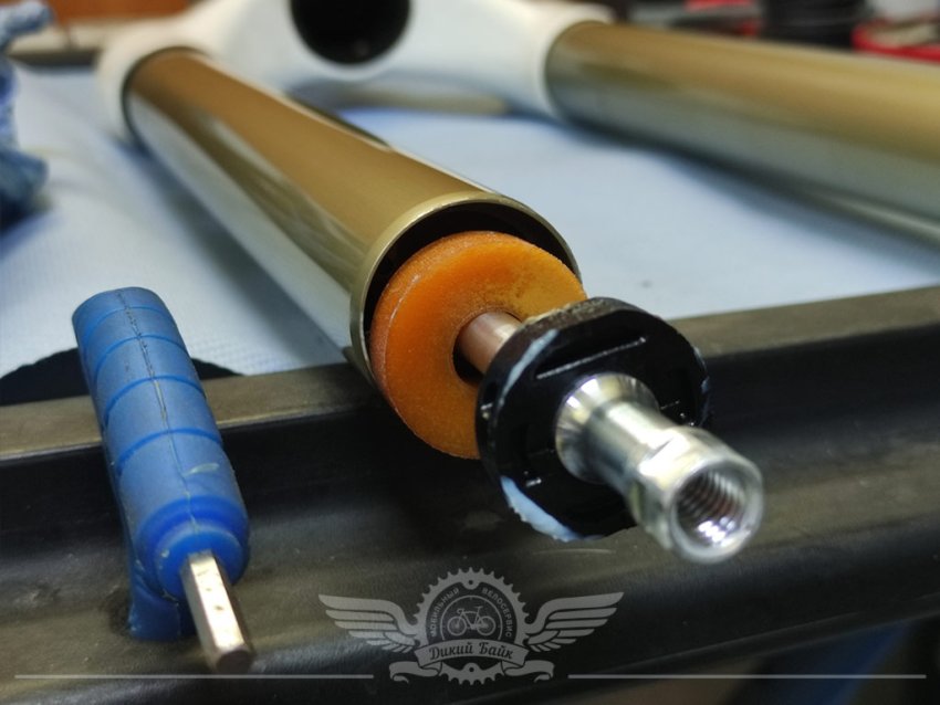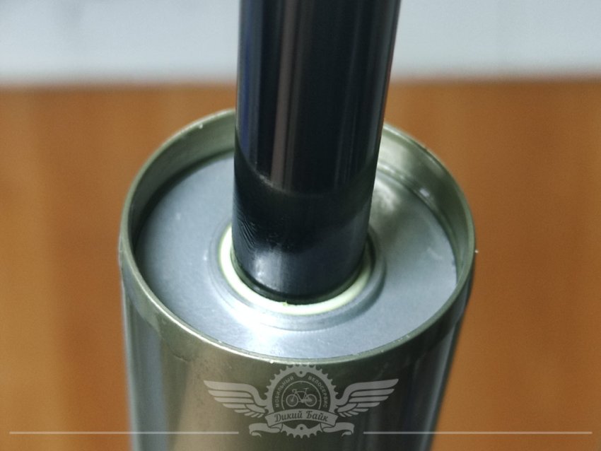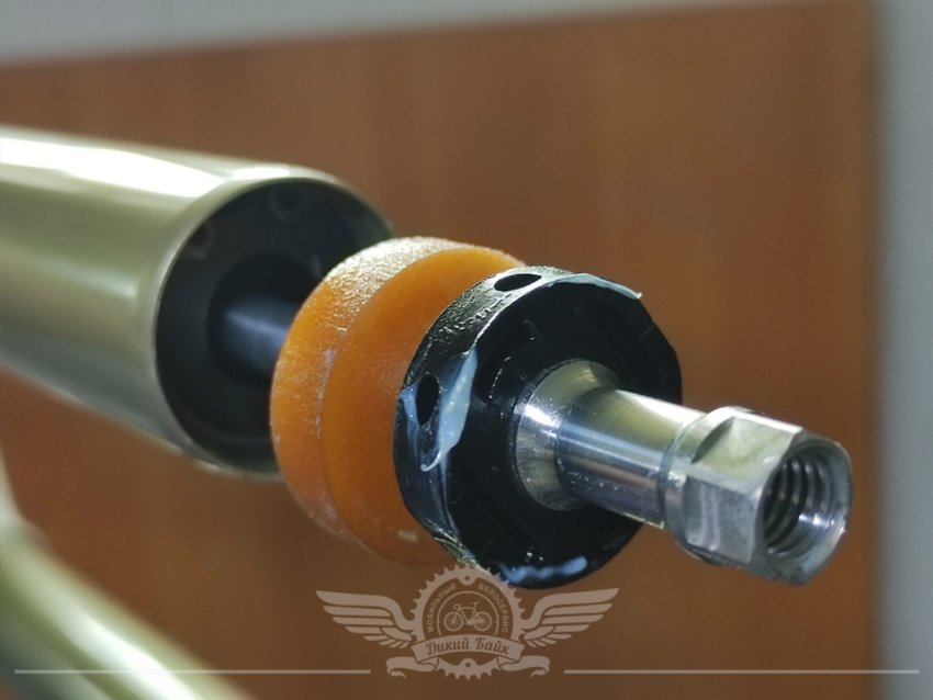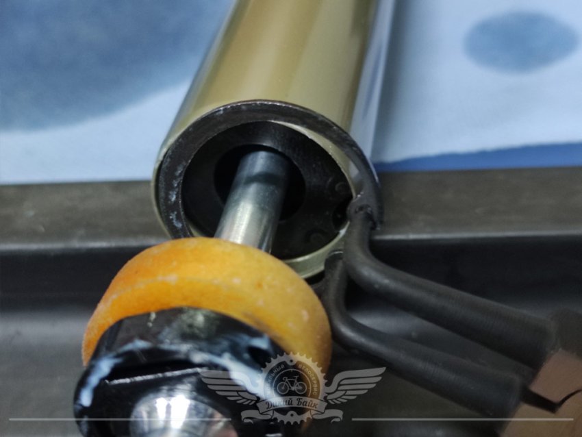 Наносим смазку на оринг стакана масляного демпфера и покачивая вставляем в ногу вилки.